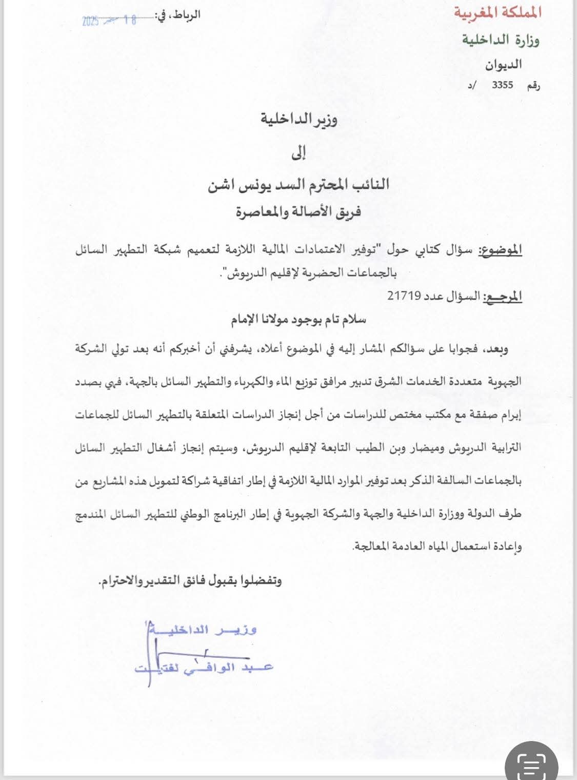 وكان النائب البرلماني يونس أشن قد أثار في سؤاله الكتابي معاناة ساكنة عدد من جماعات إقليم الدريوش مع غياب شبكة التطهير السائل، وما يترتب عن ذلك من انعكاسات سلبية على البيئة والصحة العامة، مؤكدا على ضرورة التسريع بتنزيل هذه المشاريع التي طال انتظارها.