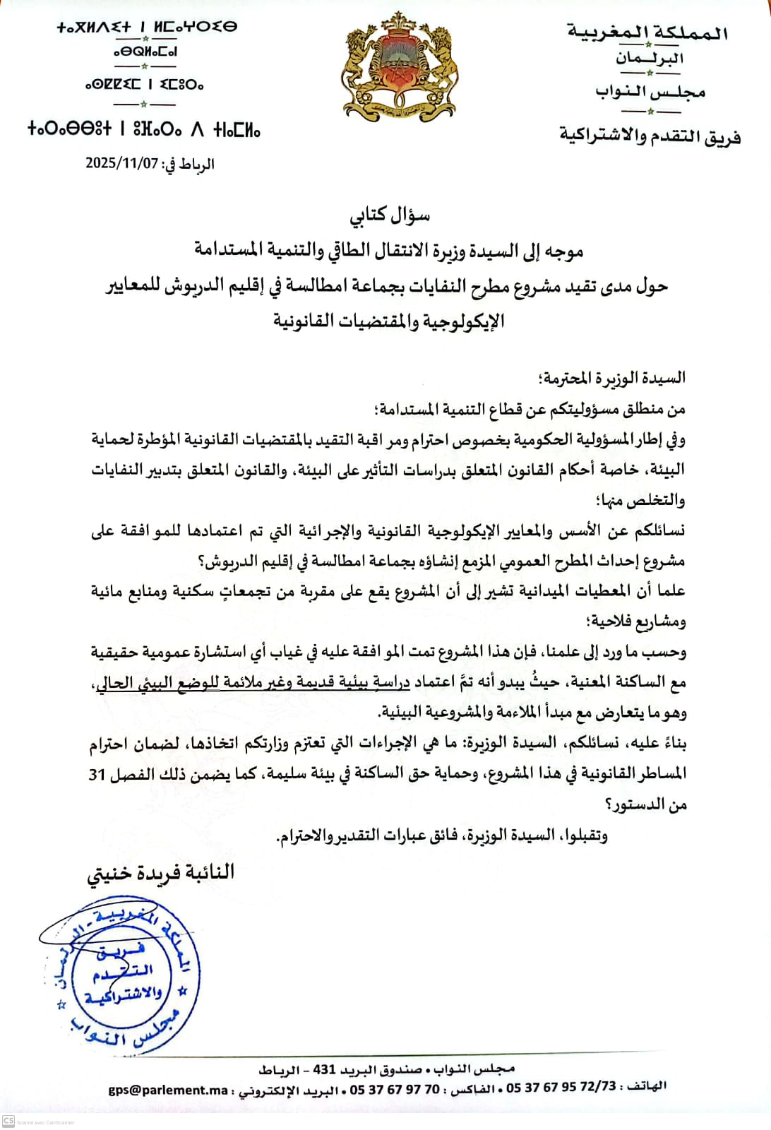 يشهد ملف مشروع إحداث المطرح العمومي بجماعة امطالسة التابعة لإقليم الدريوش تطورا جديدا بعد توجيه فريق التقدم والاشتراكية بمجلس النواب سؤالا كتابيا إلى السيدة وزيرة الانتقال الطاقي والتنمية المستدامة، حول مدى احترام المشروع لمعايير التنمية المستدامة والمقتضيات القانونية والبيئية المؤطرة لتدبير النفايات.