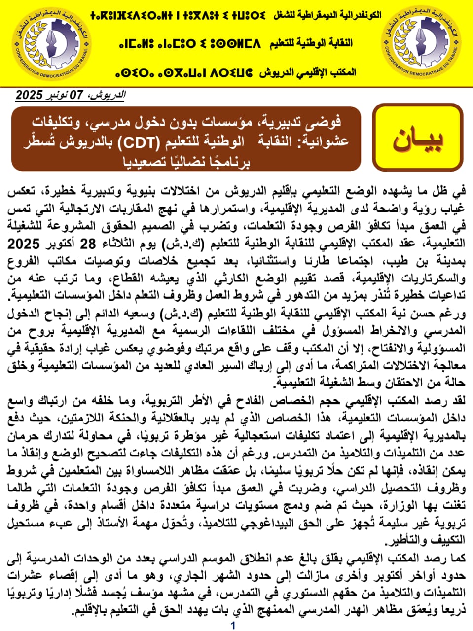 أصدر المكتب الإقليمي للنقابة الوطنية للتعليم (ك.د.ش) بالدريوش بيانًا شديد اللهجة، عبّر فيه عن قلقه العميق إزاء الوضع التعليمي بالإقليم خلال الموسم الدراسي الحالي، بعد تسجيله سلسلة من الاختلالات البنيوية والتدبيرية التي وصفها بـ”الخطيرة والمقلقة”، معتبرًا أنها تهدد حق التلاميذ في التمدرس وتضرب في العمق مبدأ تكافؤ الفرص وجودة التعلمات.