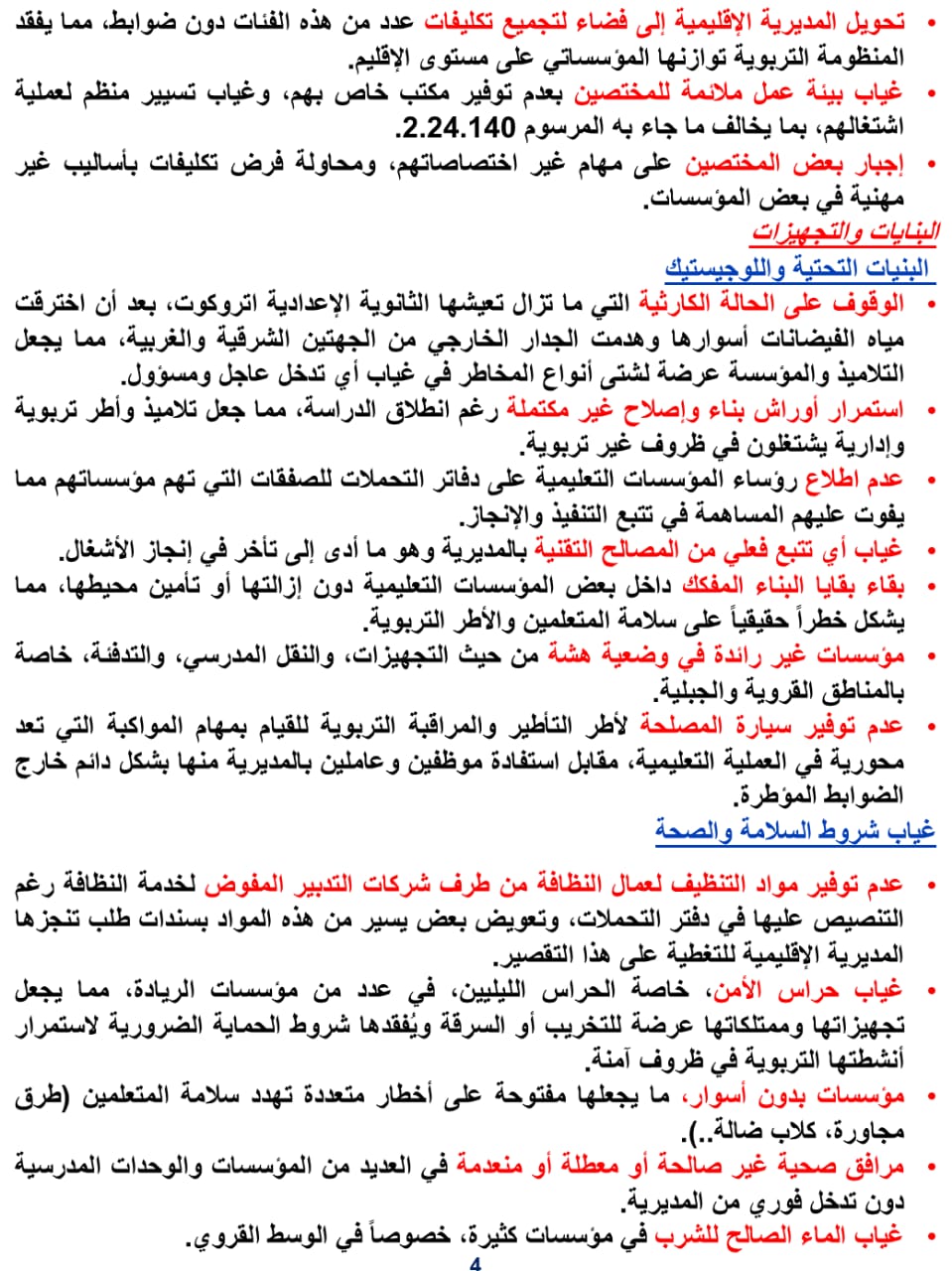 ولم يفت المكتب الإقليمي أن يُسجّل تدهور وضع البنيات التحتية وغياب شروط السلامة والصحة داخل العديد من المؤسسات التعليمية، التي تعاني من أزمة خانقة في المرافق الصحية وغياب الأسوار الواقية، ما يجعلها عرضة لمخاطر متعددة تمس سلامة المتعلمين والأطر على حد سواء، خصوصًا بعد الأضرار التي خلفتها التساقطات المطرية الأخيرة بعدد من المؤسسات.