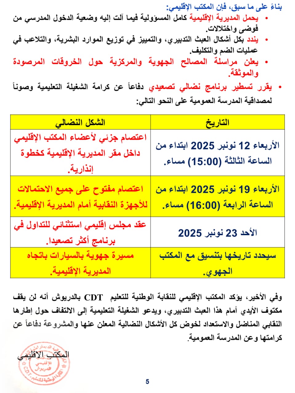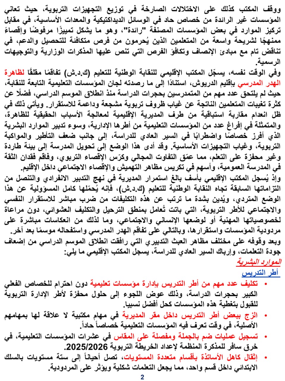 واعتبرت النقابة أن استمرار هذا الوضع يُشكّل مؤشرًا خطيرًا على غياب الحكامة التربوية وضعف التدبير الاستباقي من طرف المديرية الإقليمية، مطالبةً وزارة التربية الوطنية بالتدخل العاجل لوضع حد لهذا التدهور الذي يهدد مستقبل المتمدرسين بالإقليم.