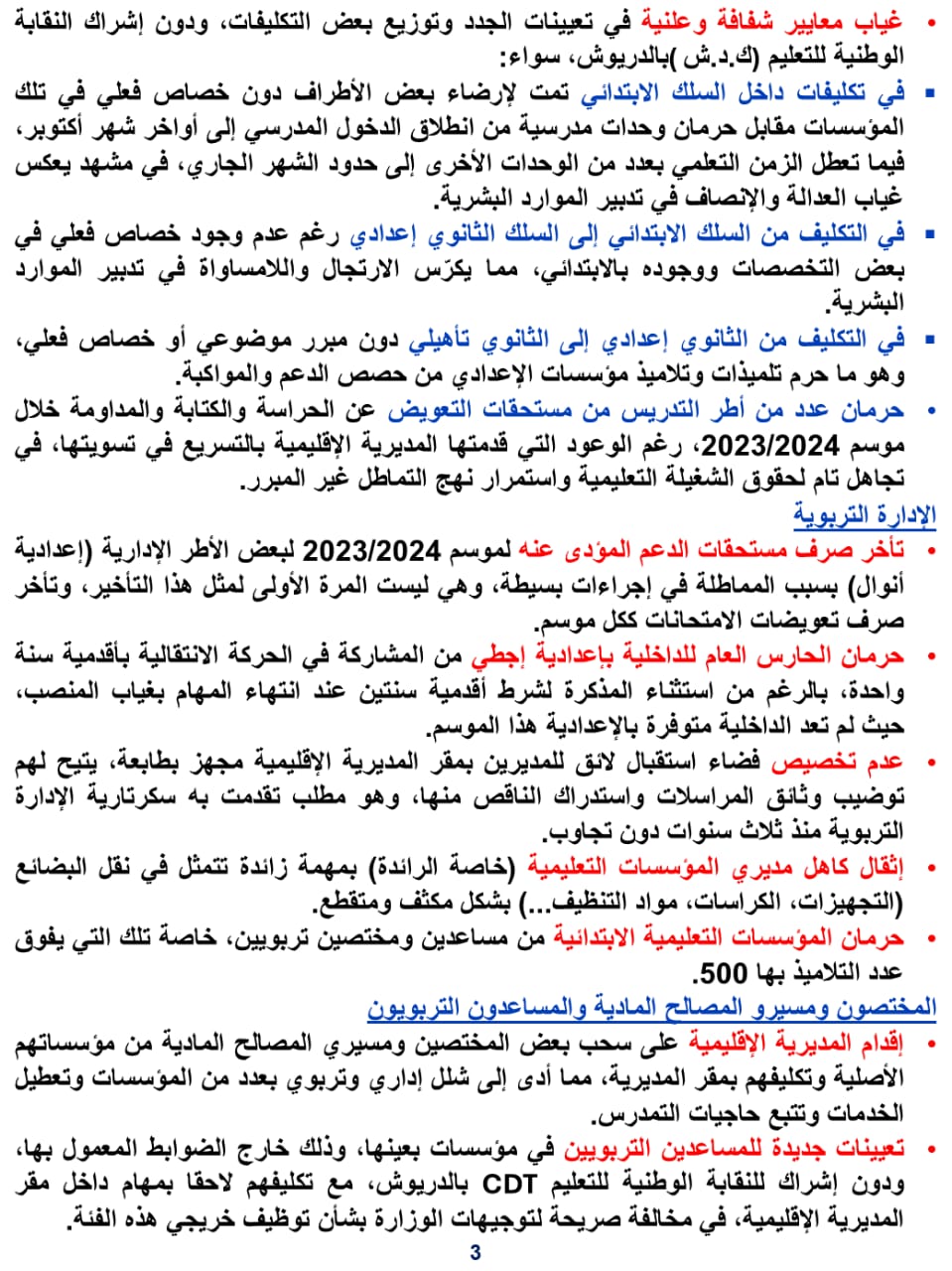 كما حمّل البيان المديرية الإقليمية مسؤولية سوء تدبير الموارد البشرية، مشيرًا إلى أن الخصاص في الأطر التربوية والإدارية لم يُدبَّر بالعقلانية اللازمة، مما خلق ارتباكًا واضحًا في السير العادي للموسم الدراسي. كما ندد بـضعف التجهيزات داخل المؤسسات غير الرائدة التي ما تزال تعاني من غياب الوسائل الديداكتيكية والمعدات الأساسية، مقابل تركيز الدعم في مؤسسات محدودة مصنفة “رائدة”، مما يعمّق التفاوت المجالي بين المتعلمين داخل الإقليم.