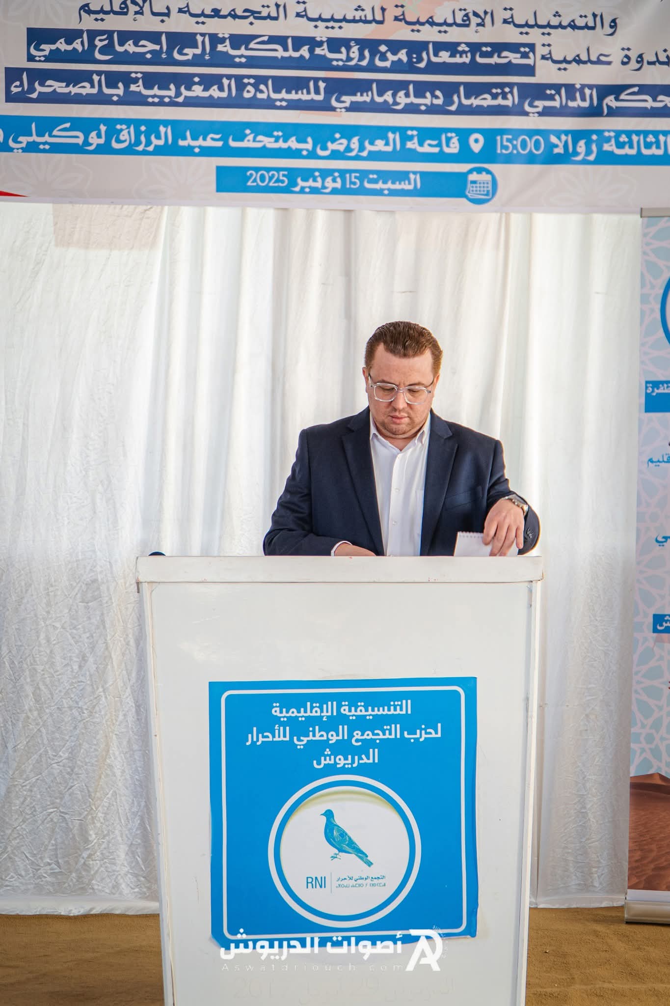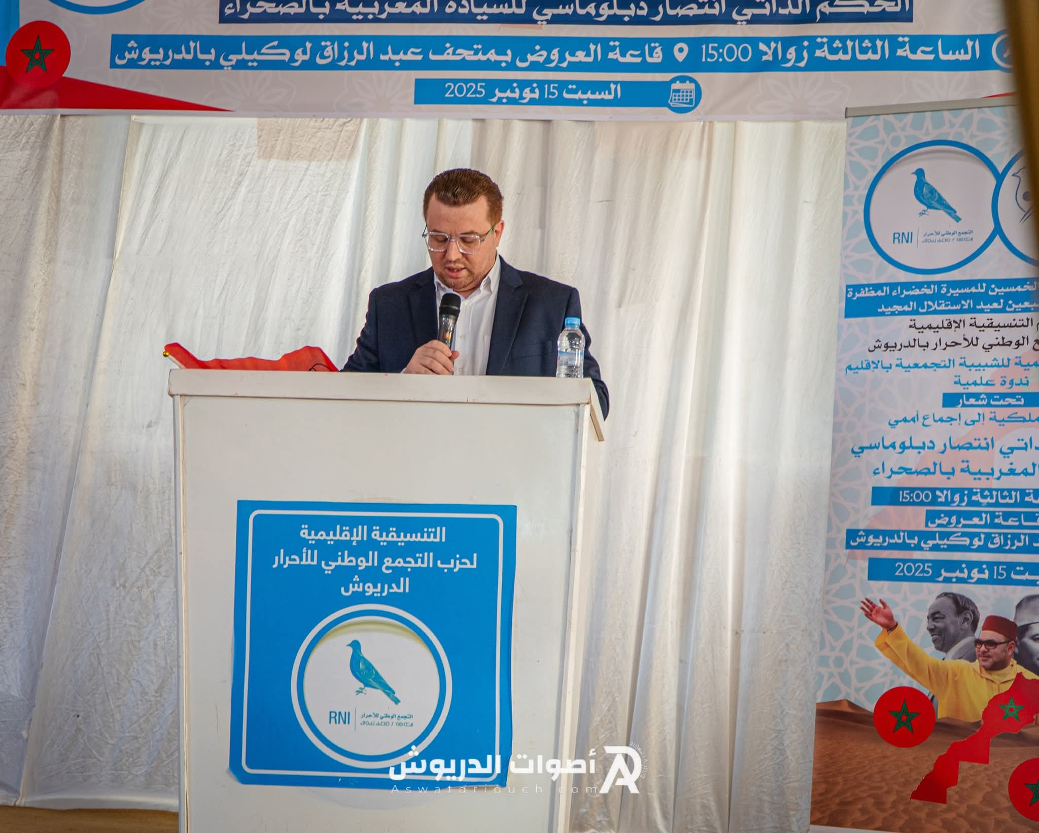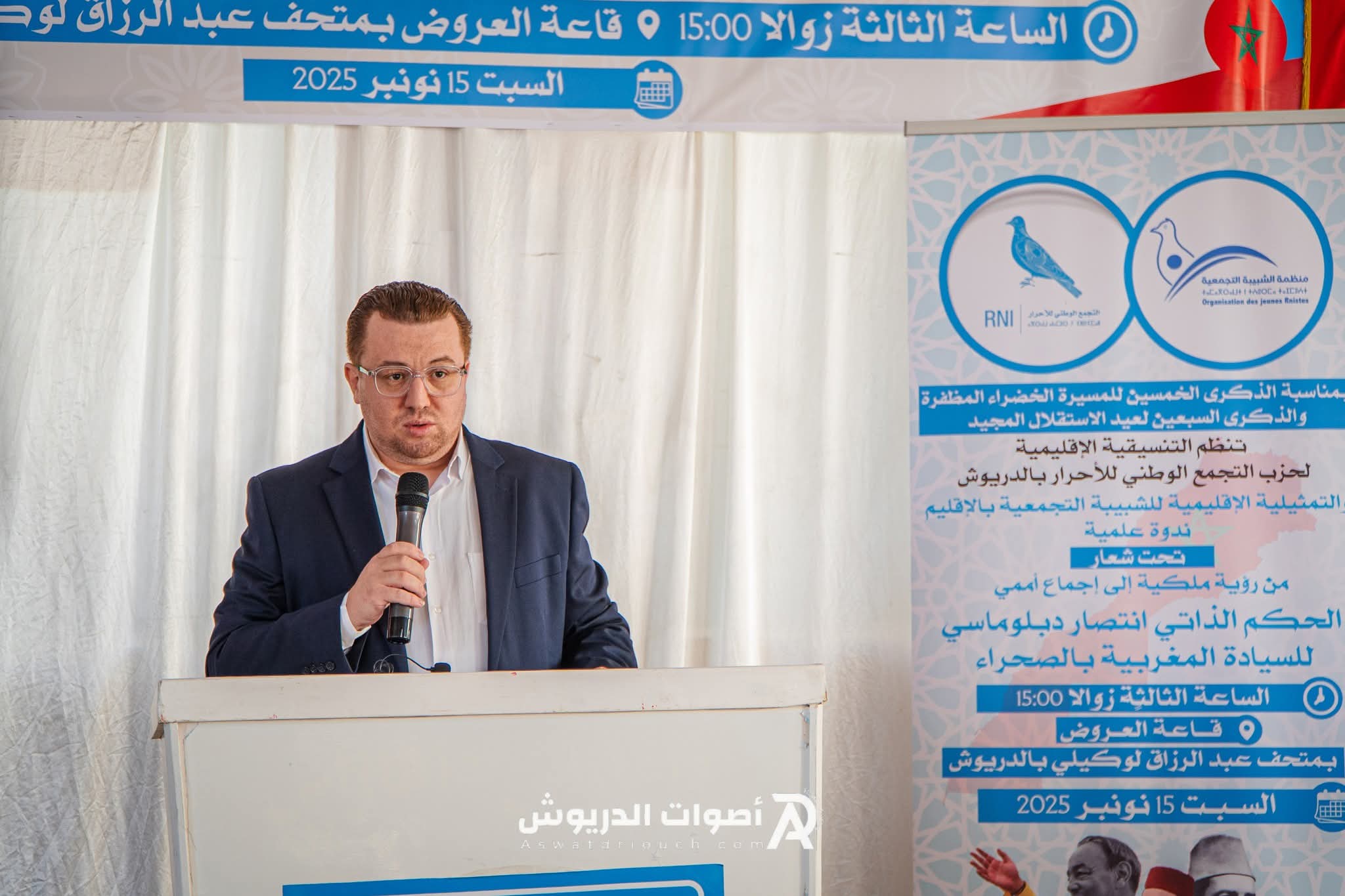 نظمت الشبيبة التجمعية بمدينة الدريوش، مساء السبت 15 نونبر 2025، ندوة علمية تحت شعار: “من رؤية ملكية إلى إجماع أممي… الحكم الذاتي انتصار دبلوماسي للسيادة المغربية بالصحراء”، وذلك بمناسبة الذكرى الخمسين للمسيرة الخضراء المظفرة والذكرى السبعين لعيد الاستقلال.