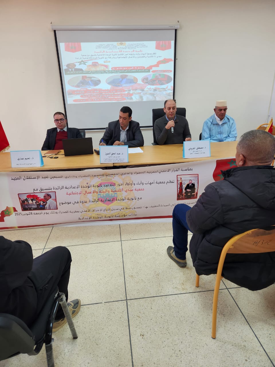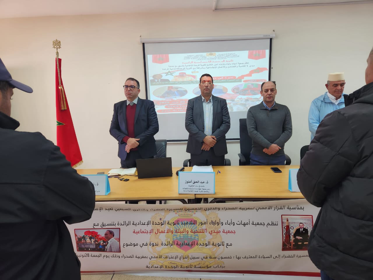 ونظمت الندوة بشراكة بين ثانوية الوحدة الاعدادية وجمعية امهات واباء واولياء التلميذات والتلاميذ وجمعية ميدي 1 للتنمية والتضامن، حيث استهلت فقرات البرنامج بكلمة ترحيبية لرئيس جمعية الاباء الاستاذ عبد الحق اعنوز، تلتها تلاوة ايات من الذكر الحكيم واداء النشيد الوطني، قبل ان يلقي رئيس المؤسسة كلمة سلط فيها الضوء على اهمية القرار الاممي الاخير، واصفا اياه بانتصار دبلوماسي للمغرب، ومشددا على ضرورة اليقظة في مواجهة اي محاولات تهدف الى المساس بوحدة البلاد واستقرارها.