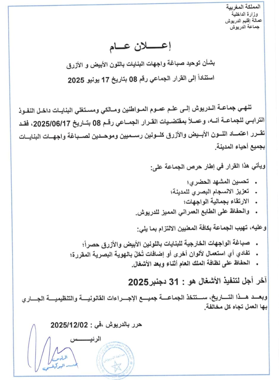 القرار، الذي يدخل ضمن رؤية الجماعة الهادفة إلى إرساء انسجام بصري موحّد يعكس الهوية المعمارية المميزة للدريوش، يلزم ملاّك ومستغلي البنايات بضرورة الالتزام بالصباغة المعتمدة قبل انتهاء الأجل المحدد يوم 31 دجنبر 2025.