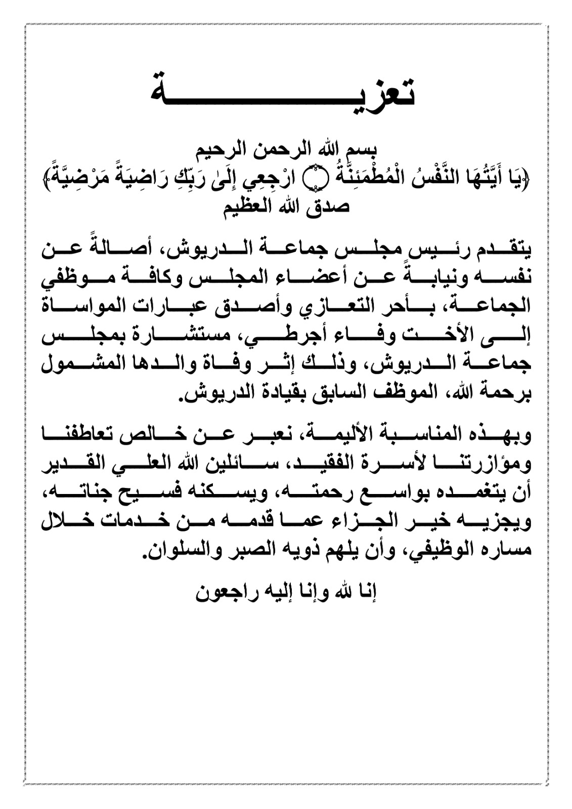 يتقدم رئيس مجلس جماعة الدريوش، أصالةً عن نفسه ونيابة عن أعضاء المجلس وكافة موظفي الجماعة، بأحر التعازي وأصدق عبارات المواساة إلى الأخت وفاء أجرطي، مستشارة بمجلس جماعة الدريوش، وذلك إثر وفاة والدها المشمول برحمة الله، الموظف السابق بقيادة الدريوش.