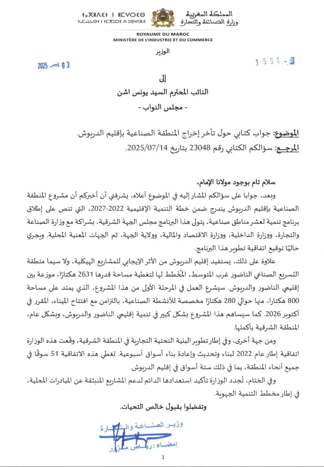 قدم وزير الصناعة والتجارة رياض مزور جوابا كتابيا على سؤال كان قد تقدم به النائب البرلماني يونس أشن عن حزب الأصالة والمعاصرة، دائرة الدريوش، بخصوص أسباب تأخر إخراج مشروع المنطقة الصناعية بإقليم الدريوش إلى حيز الوجود.