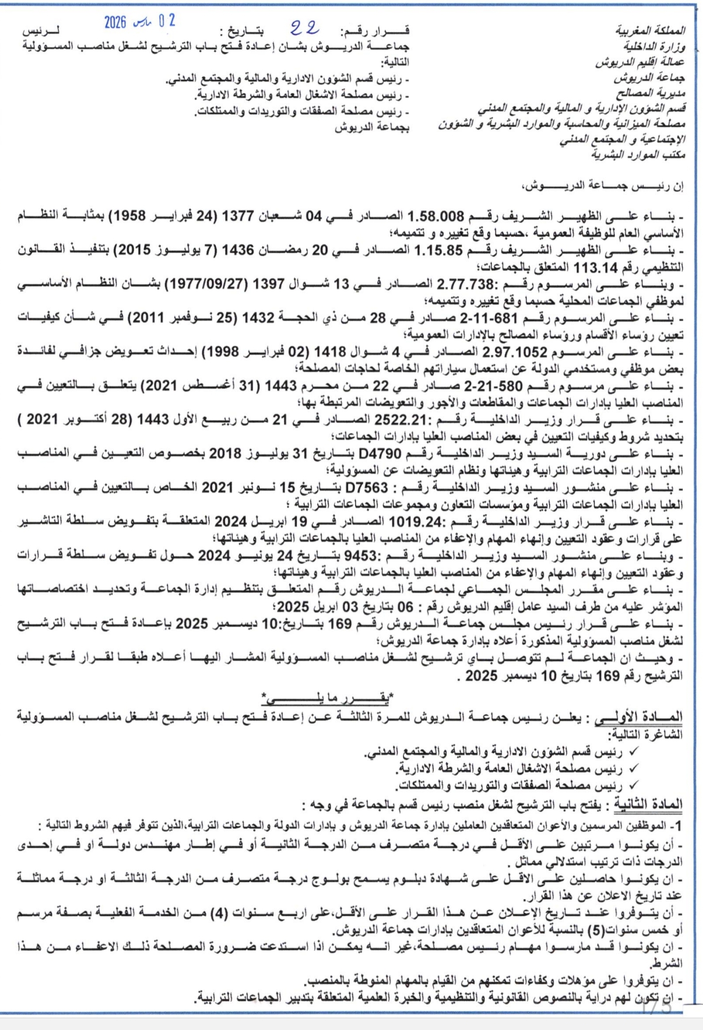 جماعة الدريوش تعيد فتح باب الترشيح لثلاثة مناصب مسؤولية بعد غياب المترشحين