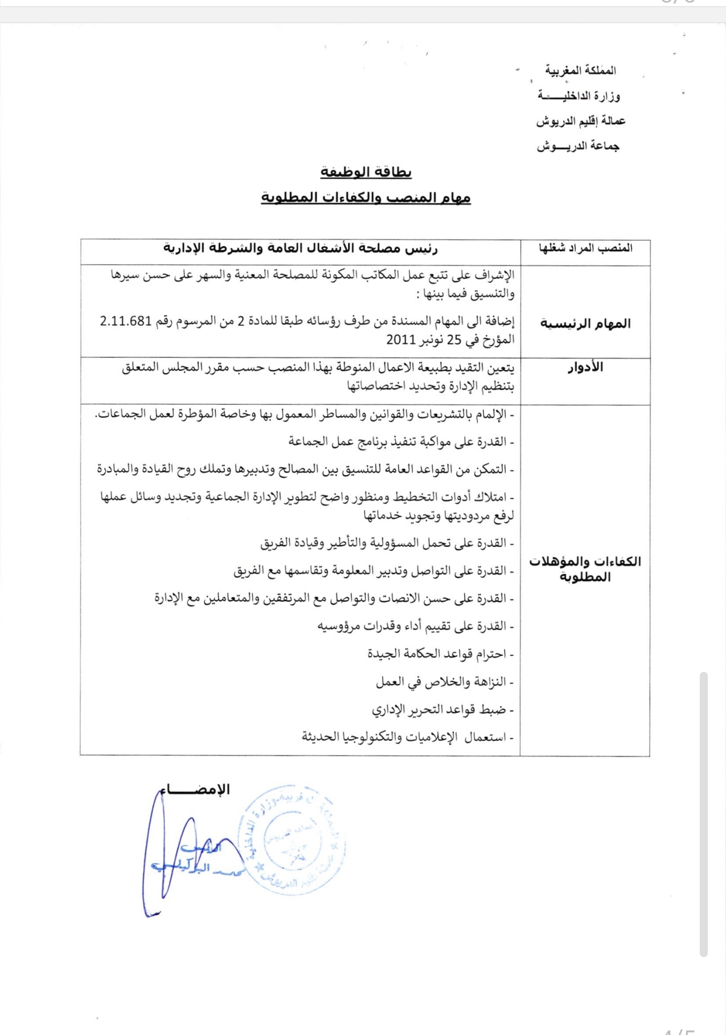 ويهم هذا القرار، الصادر عن رئيس مجلس الجماعة، مناصب رئيس قسم الشؤون الإدارية والمالية والمجتمع المدني، ورئيس مصلحة الأشغال العامة والشرطة الإدارية، إضافة إلى رئيس مصلحة الصفقات والتوريدات والممتلكات.