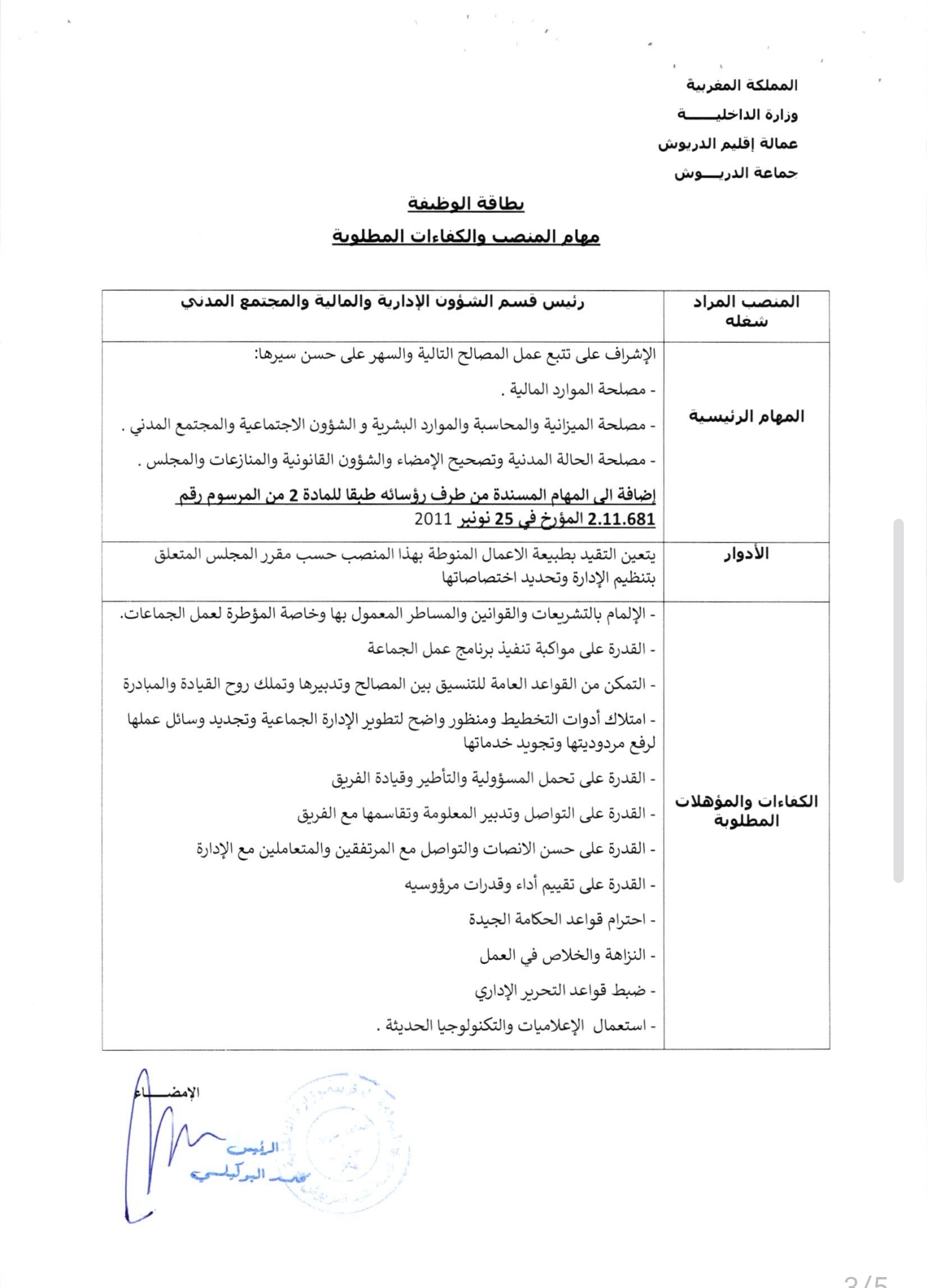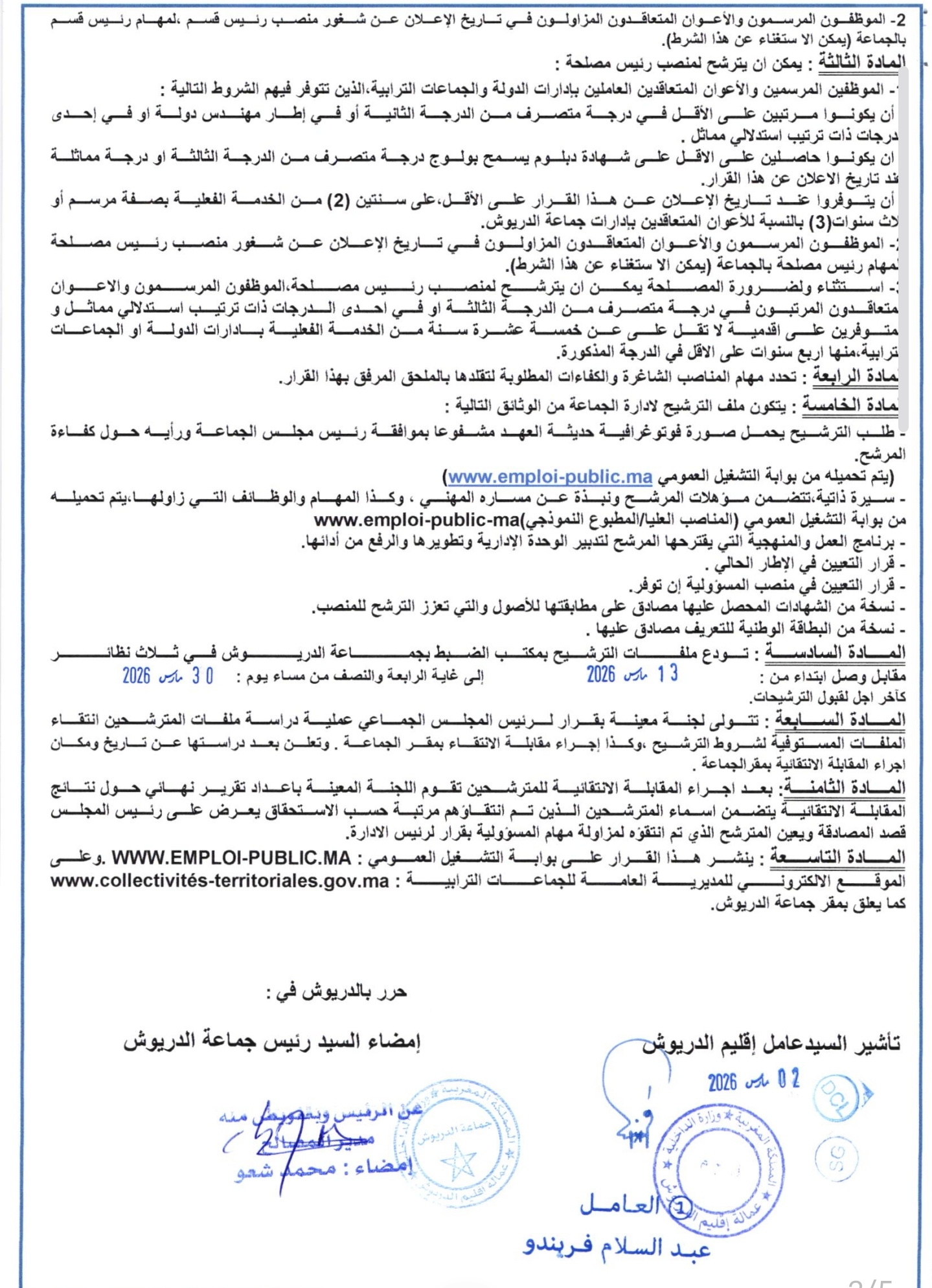 جماعة الدريوش تعيد فتح باب الترشيح لثلاثة مناصب مسؤولية بعد غياب المترشحين